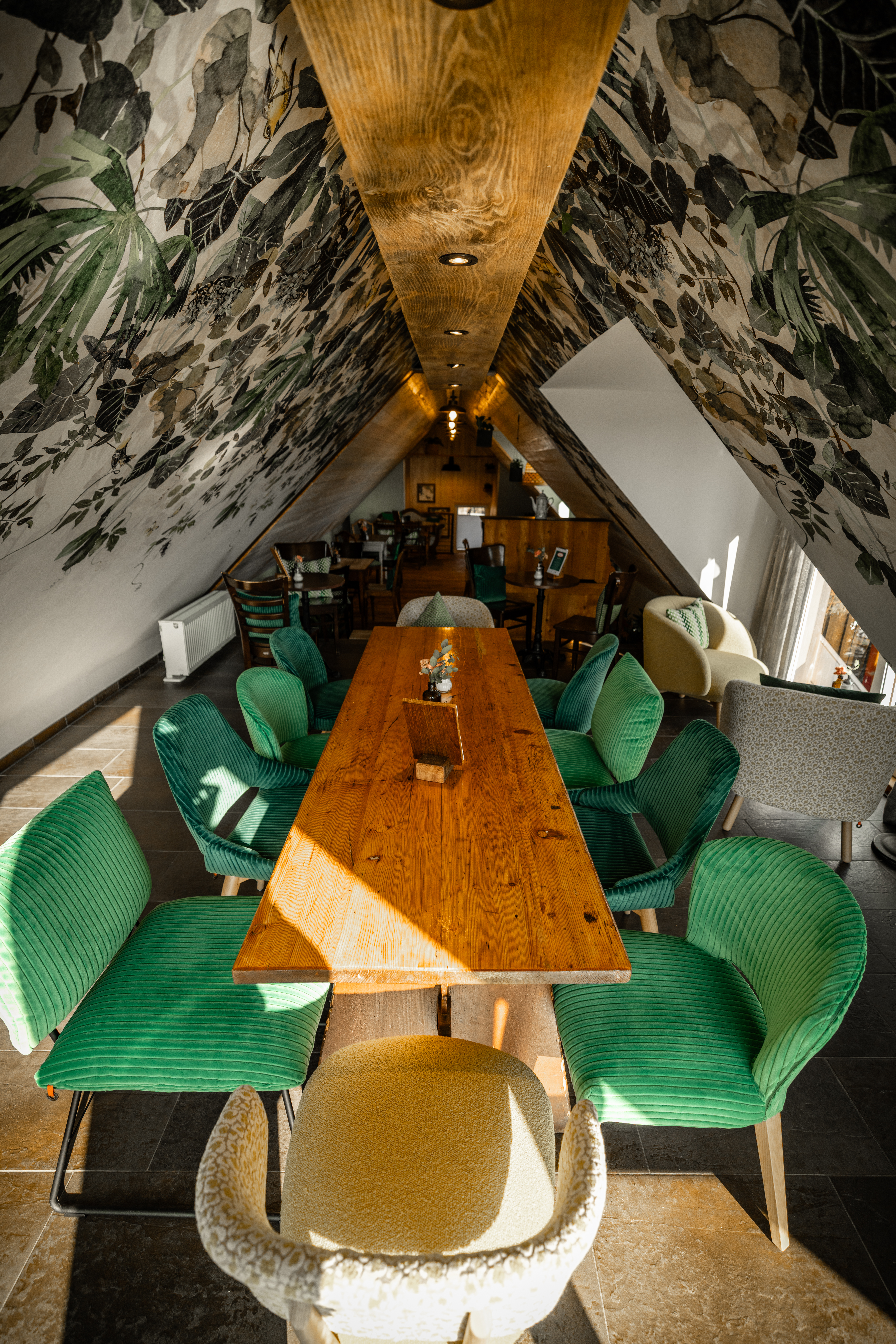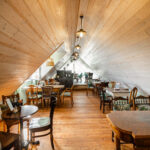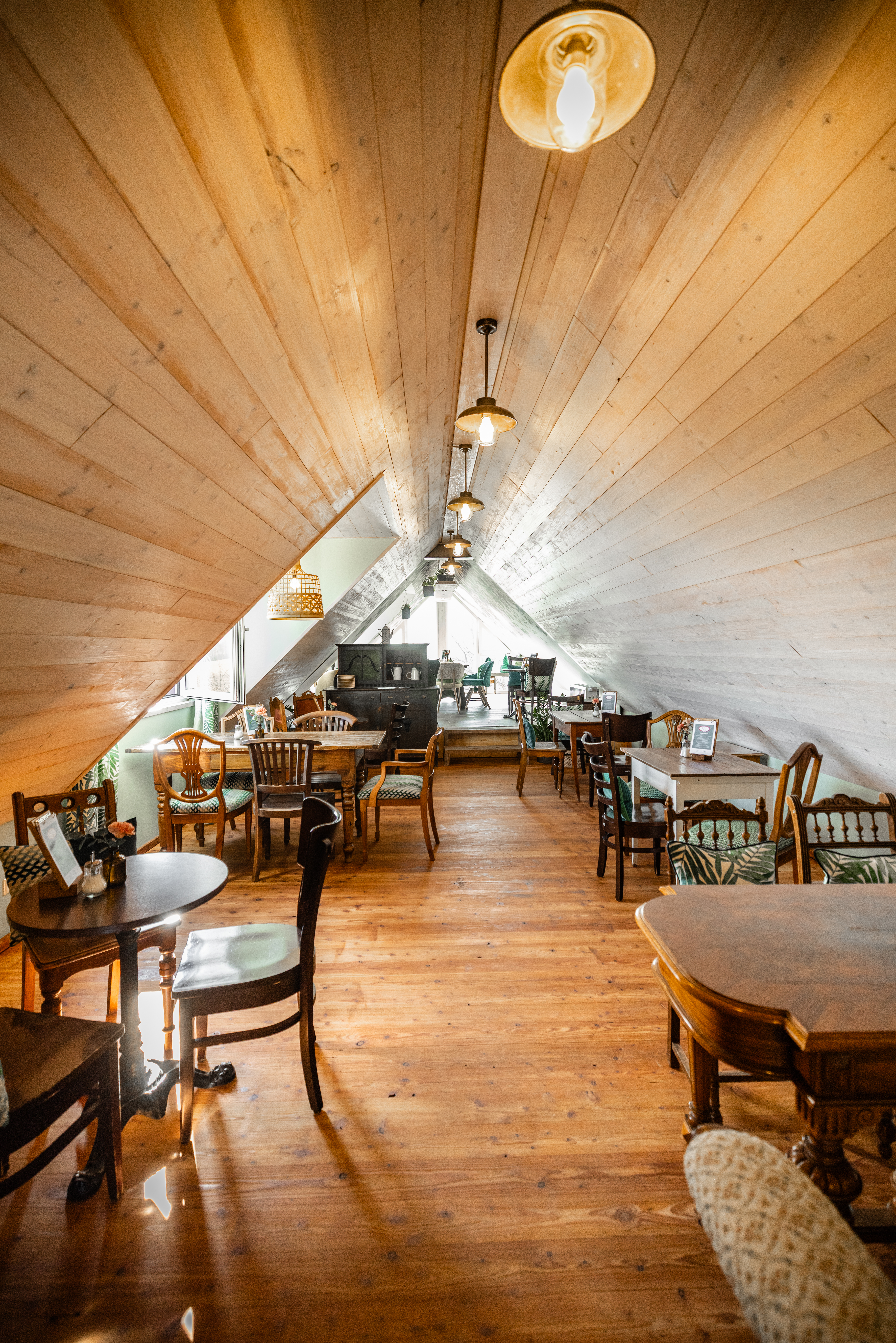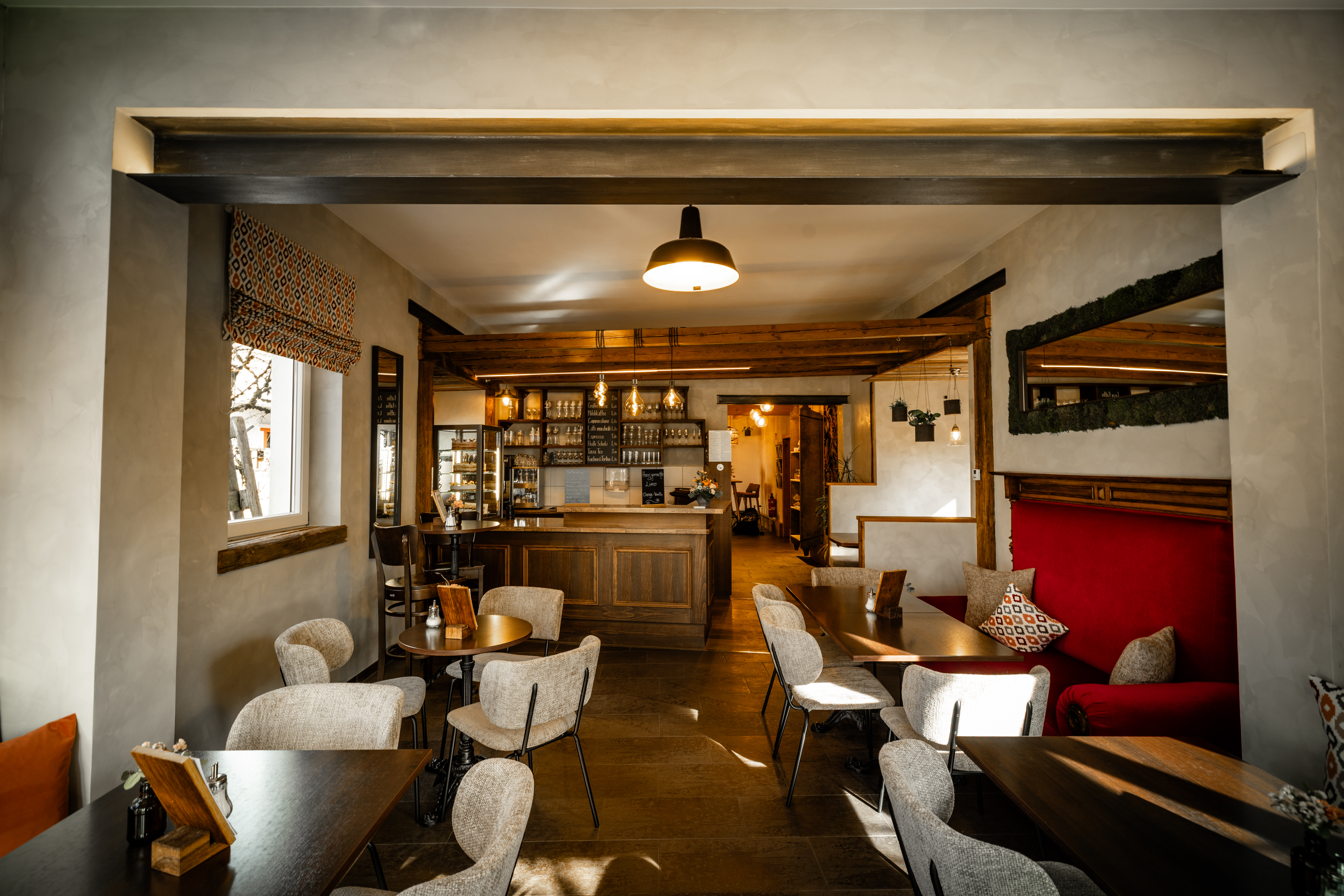 Impressionen Innenraum Theke unten Innenraum Café unten Obergeschoss Café Obergeschloss Café mit neu gestaltetem Giebel Eingangsbereich Café Kinderspielecke Kokos-Mangotorte